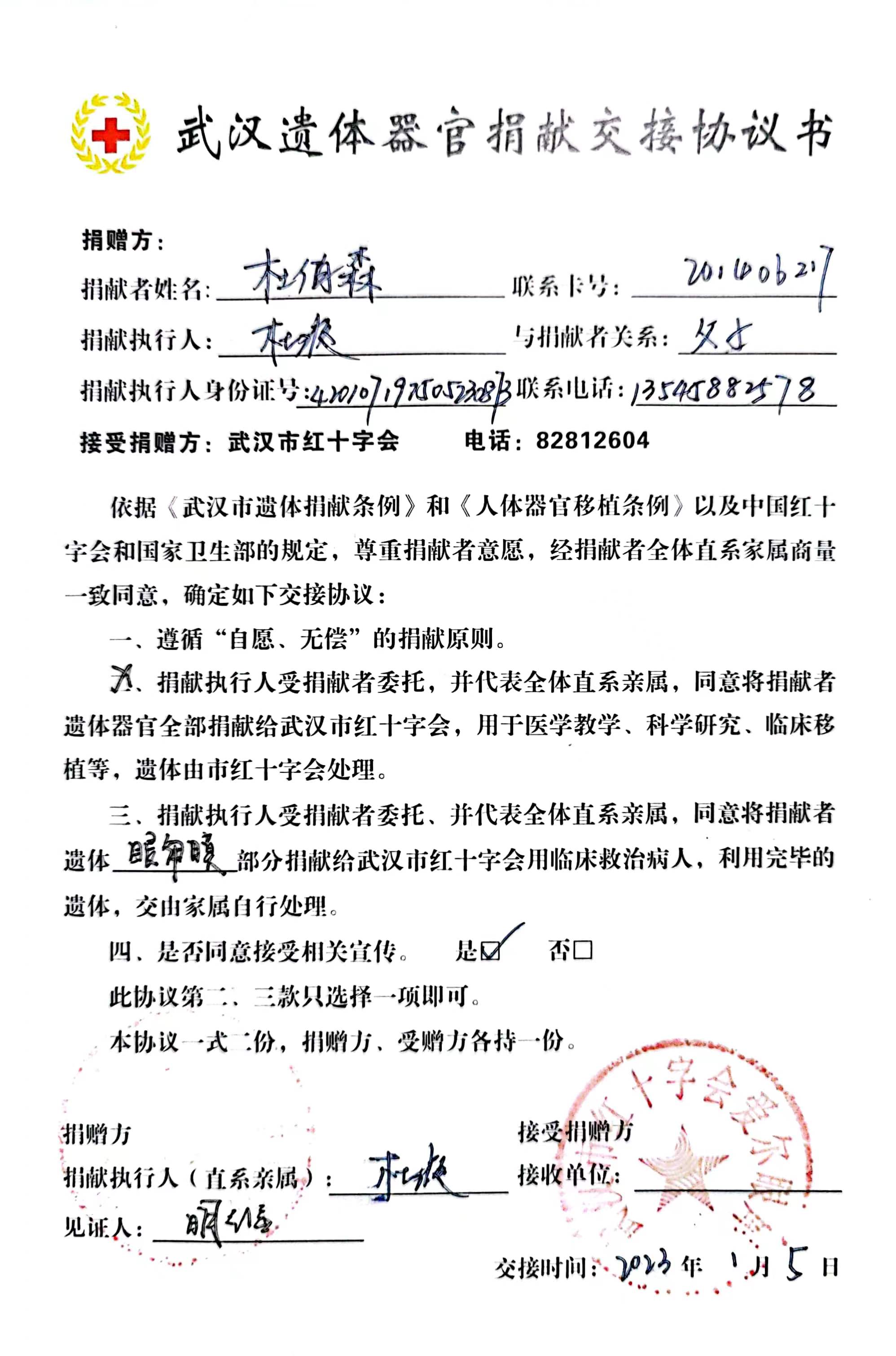 2023年1月5日,武漢七旬老黨員杜伯森不幸病逝,家人遵其生前遺愿,捐獻眼角膜、遺體。杜老用最樸實的行為詮釋了一名共產黨員無私奉獻的情懷。