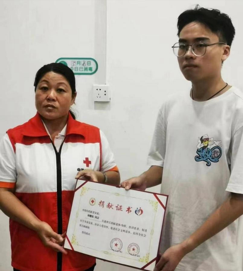 ▲何繼東兒子何貴蔚(右1)從百色市紅十字會(huì)工作人員手上接過(guò)捐獻(xiàn)證書(shū)