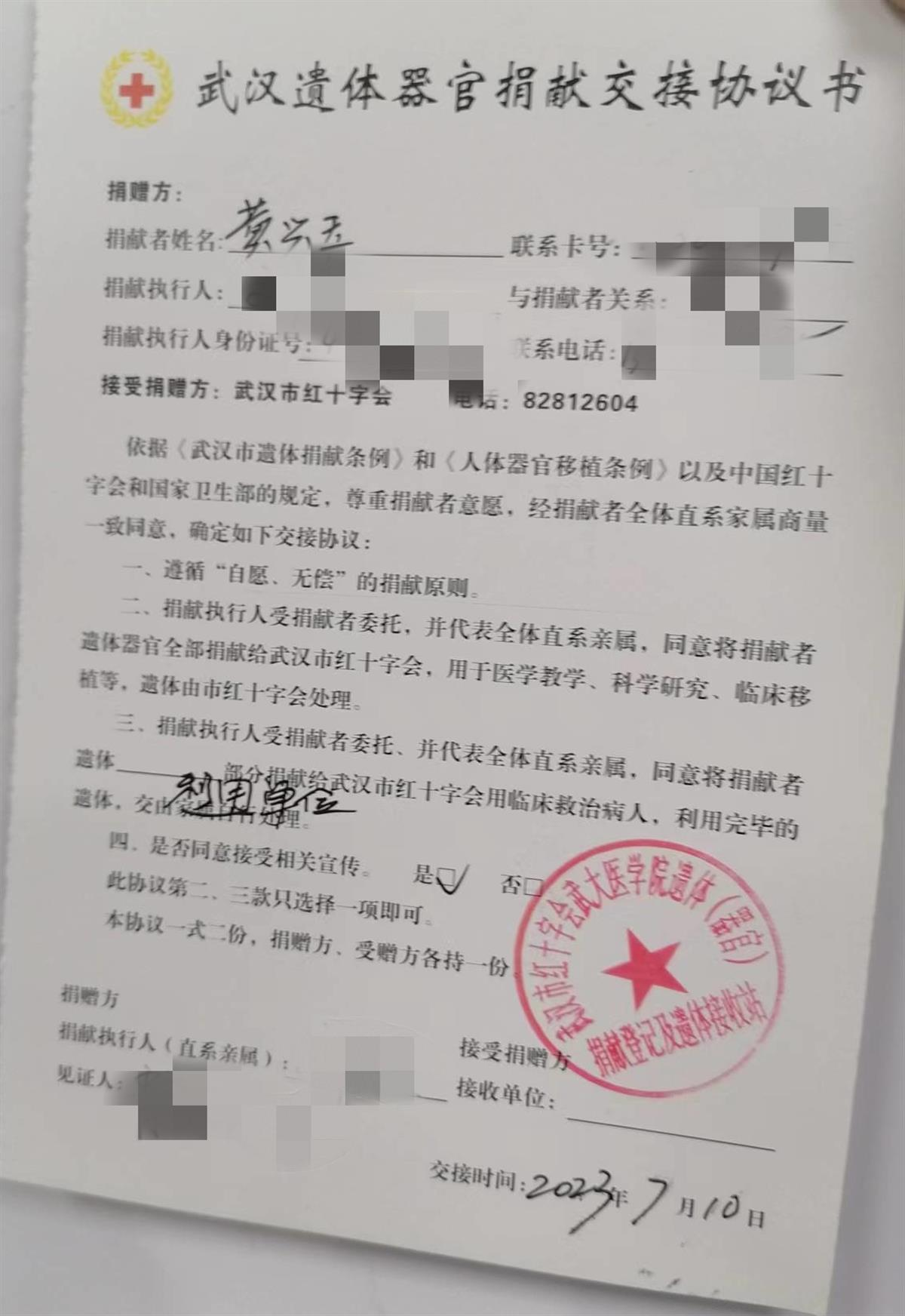 2021年3月,黃興玉和兒子劉敏一起申請登記成為遺體捐獻志愿者。今年7月,黃興玉病重時,要求兒子一定要幫她實現(xiàn)捐獻的愿望。7月10日,黃興玉離世,兒子劉敏遵照母親的遺愿,將其遺體捐獻給武漢市紅十字武大醫(yī)學(xué)院,眼角膜捐獻給武漢市紅十字愛爾眼庫。
