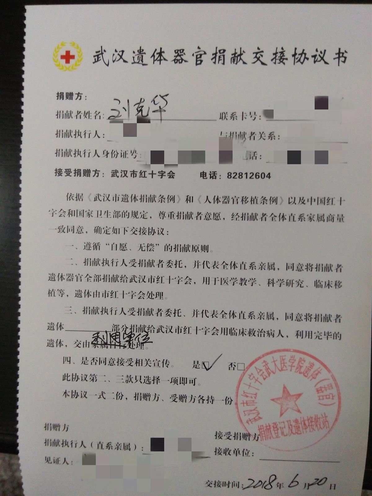 黃興玉和老伴的遺體器官交接協(xié)議書
