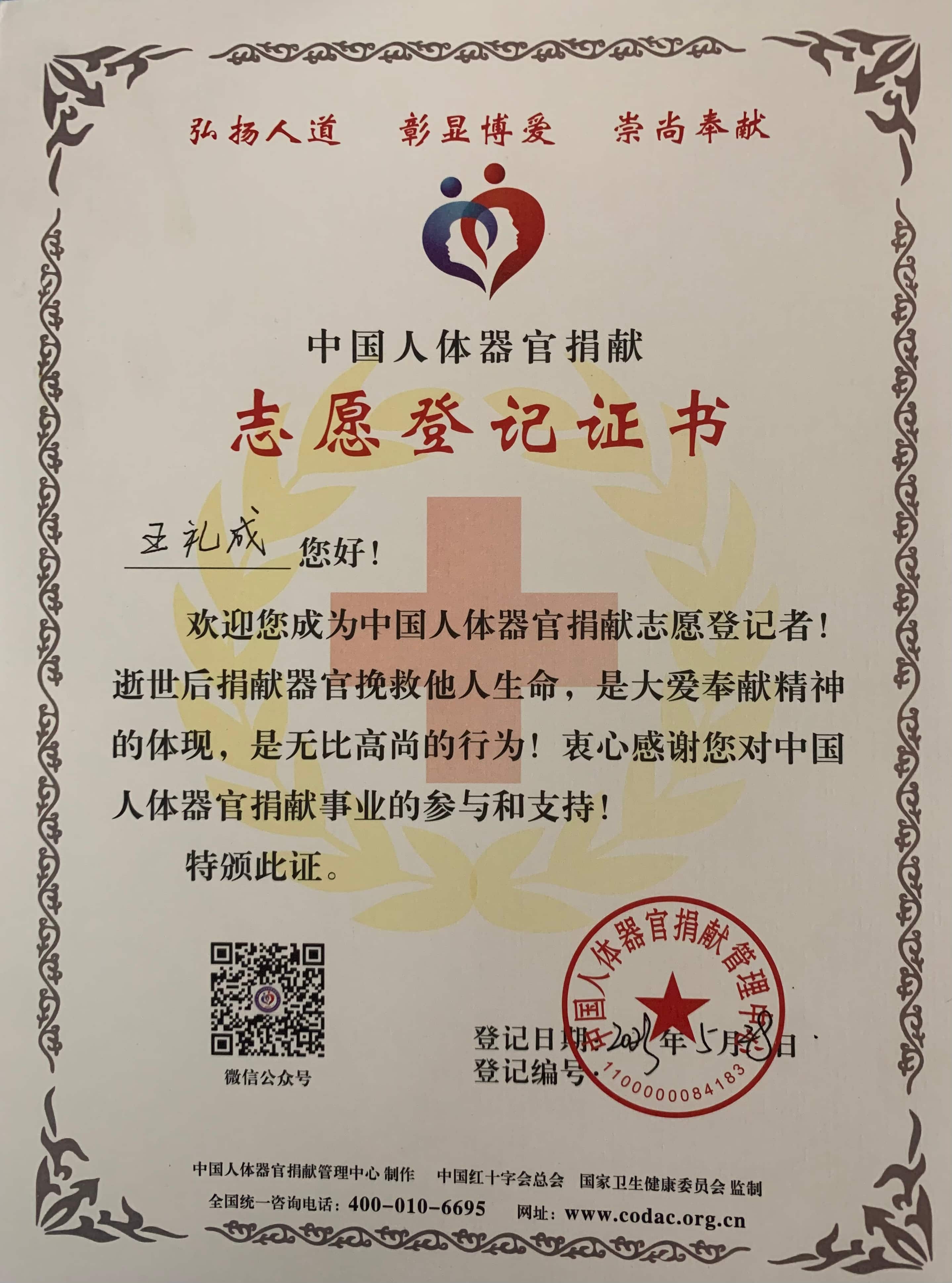 王禮成的妻子龍春華說,老伴是畜牧水產(chǎn)局退休的干部,她和兒子都是教師,曾經(jīng)他們在報紙上看到過關(guān)于遺體(器官)捐獻的信息,其實老伴在生病前就有了捐獻遺體和眼角膜的念頭,曾跟她說過“國家培養(yǎng)了我,死后我要把身體捐獻給國家!”王禮成在臨終前還特別交代家人,一定要幫助他完成自己捐獻眼角膜和遺體的心愿,希望自己的角膜能幫助他人重見光明,遺體能用于醫(yī)學教學。