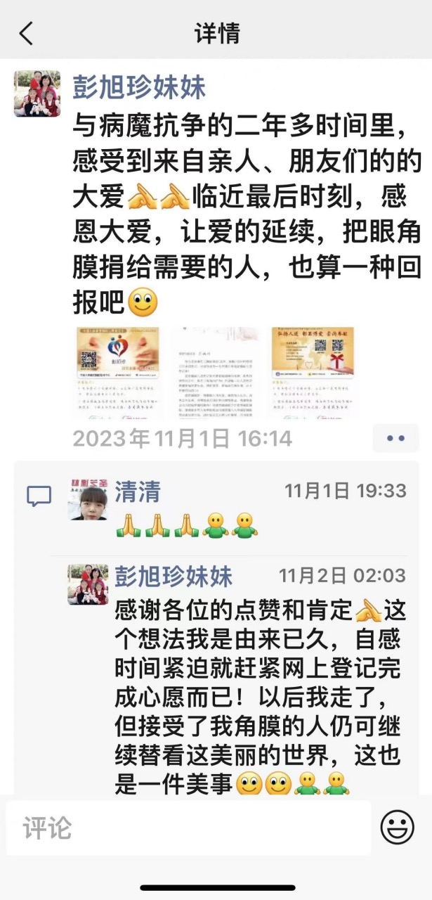 今年10月24日,說話已經(jīng)非常吃力的彭旭珍拜托哥哥幫她聯(lián)系辦理角膜捐獻(xiàn)登記。由于不了解捐獻(xiàn)途徑,一周后經(jīng)過多方打聽,終于聯(lián)系上湖南省紅十字角膜捐獻(xiàn)愛爾眼科接收站咨詢捐獻(xiàn)事宜。11月1日在中國(guó)人體器官捐獻(xiàn)平臺(tái)完成登記,并寫下人生最后一條朋友圈:“與病魔抗?fàn)幍亩甓鄷r(shí)間里,感受到來自親人、朋友們的大愛,臨近最后時(shí)刻,感恩大愛,讓愛延續(xù),把眼角膜捐給需要的人,也算一種回報(bào)”,并配上一張她引以為傲的中國(guó)人體器官捐獻(xiàn)志愿登記卡照片。